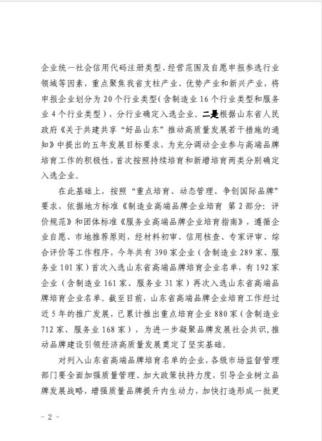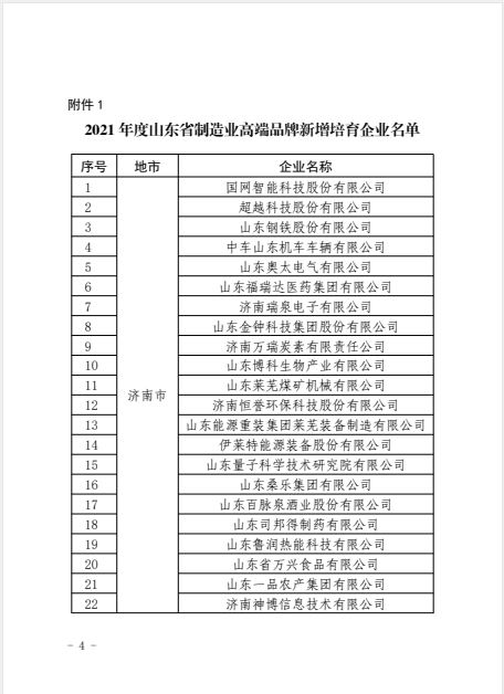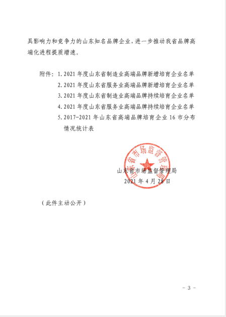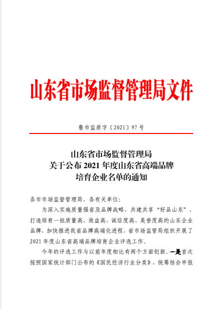 2021年4月28日,公司入選2021年度山東省高端品牌培育企業。該項榮譽的取得,標志著公司在質量管理方面又上一個新臺階。下一步,公司會更加注重品牌發展戰略,不斷增強質量品牌內生動力,不斷提升企業品牌影響力和產品競爭力。