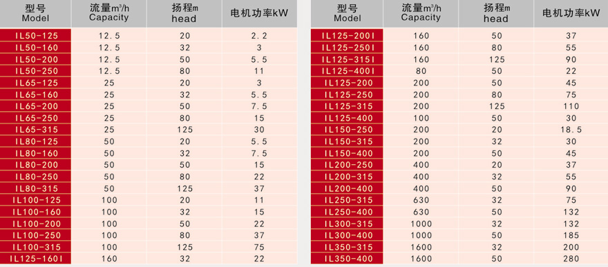 IL、ILR(ISG)系列泵系單級單吸立式離心泵,供輸送清水或理化性質類似于水、不含固體顆粒的液體之用。泵的特點為立式結構,進出水口位于同一水平高度,十分便于管道安裝。本系列泵是IS型泵的派生系列,故亦屬國家規定的節能產品范疇。IL型泵流量6.3-1920立方米/時,揚程5-125米,其性能分布符合國家標準。ILR型熱水泵,可輸送130℃以下的熱水(清水),各種IL型泵都有相應的ILR及ISG型泵供用戶選用。